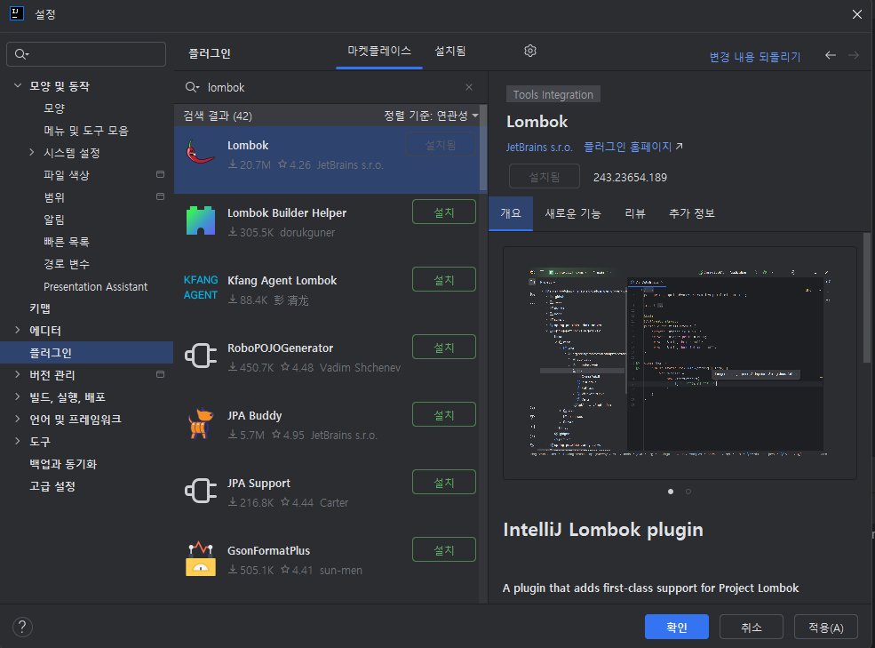 파일 -> 설정 -> 플러그인 -> lombok 검색