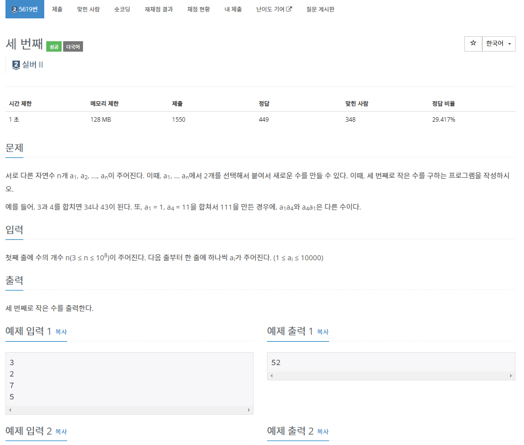 두 수를 조합해서 만들수 있는 수 중에 3번째로 작은 수를 구하는 문제이다.