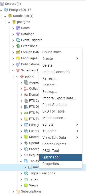 Servers -> PostgreSQL -> Database -> postgres -> Schemas -> Public -> Table 에 우클릭후 생성