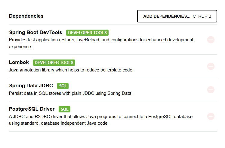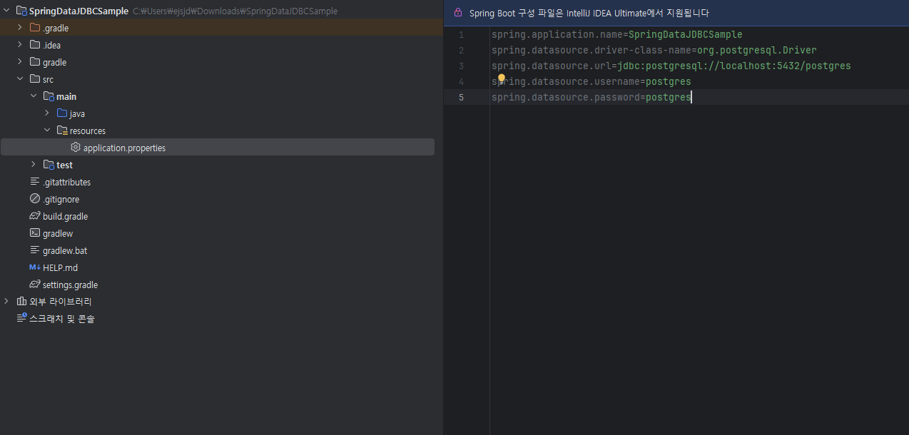 의존성에 Spring Data JDBC, Postgre SQL Driver 추가하면 Spring JDBC를 사용할 수 있다