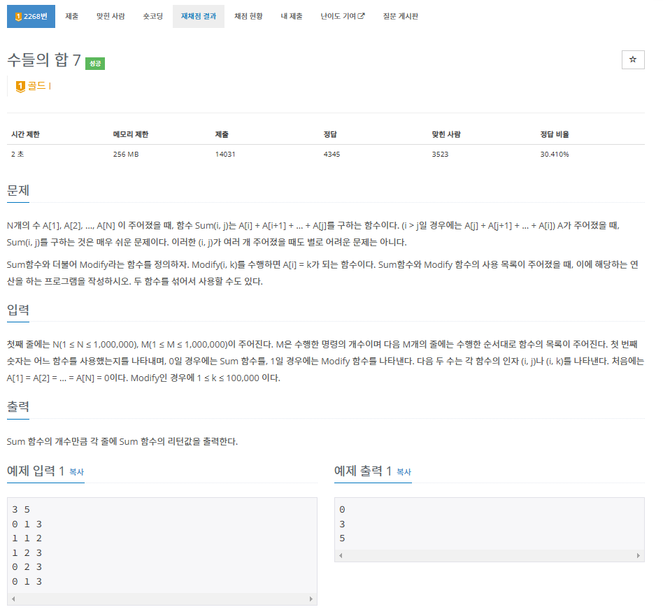 내용자체는 복잡하지 않아서 세그먼트 트리를 알면 충분히 풀수 있는 문제이지만 자바에서는 index 가 0에서 부터 시작되는데 반해 문제에서는 index 가 1부터 시작하기 때문에 혼란이 올수 있다.